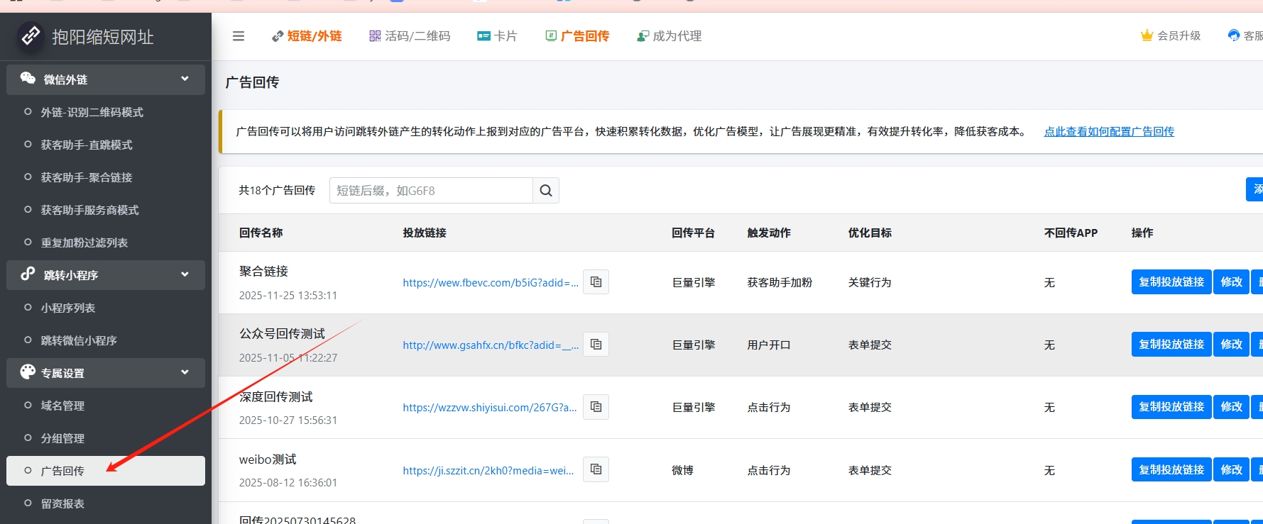 需要做广告回传的链接,都需要预先配置广告回传链接,