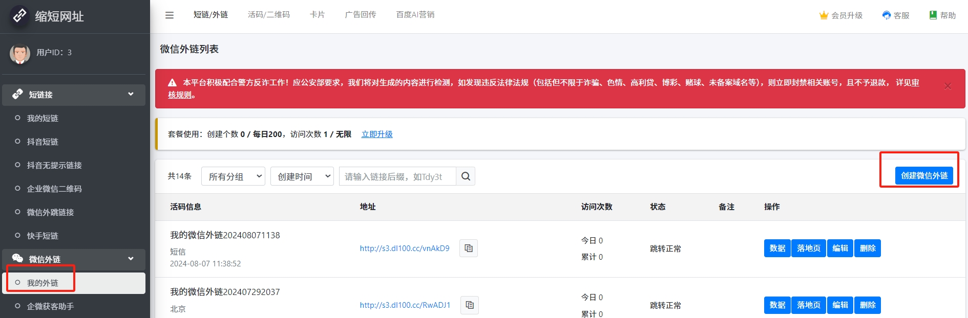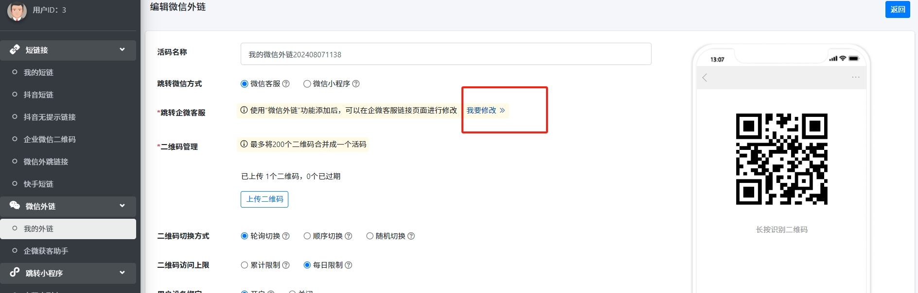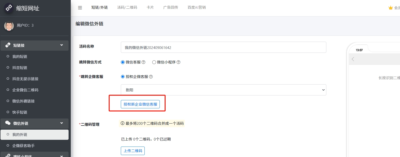 1. 进入管理后台->短链/外链->微信外链->我的外链