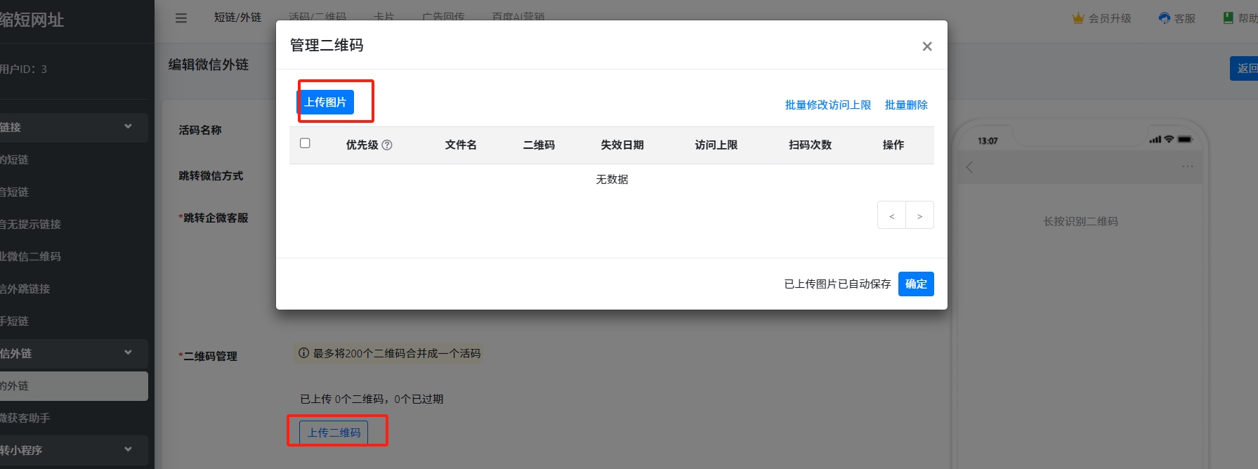 5. 点击【上传二维码】,上传你的二维码,可以是个微二维码、微信群二维码、企微二维码、公众号二维码,之后保存即可