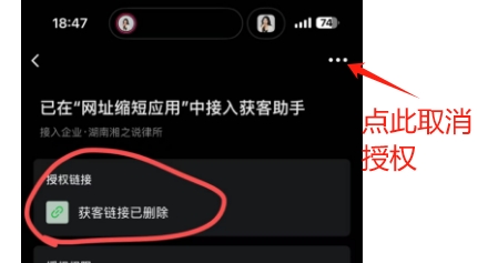 2. 解决方案:点击又上角的【...】,删除授权后重新扫码授权;或者在企微管理端后台获客助手页面底部,有一个授权接入获客助手的tab,点进查看详情页,可以操作取消授权后,再重新操作
